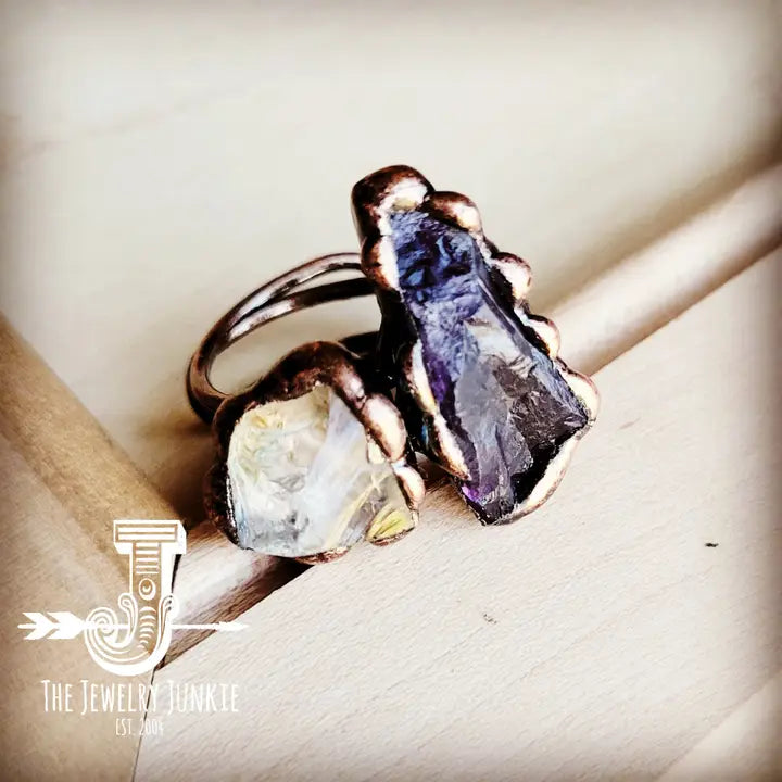 Natural Genuine Amethyst and Quartz chunky stone is encased in a copper setting. Stones will range in size from 1/2" to 1.75" Adjustable to a variety of sizes, but sized to 7 Although your item will resemble the photo, each piece is created by hand, so no two are identical.