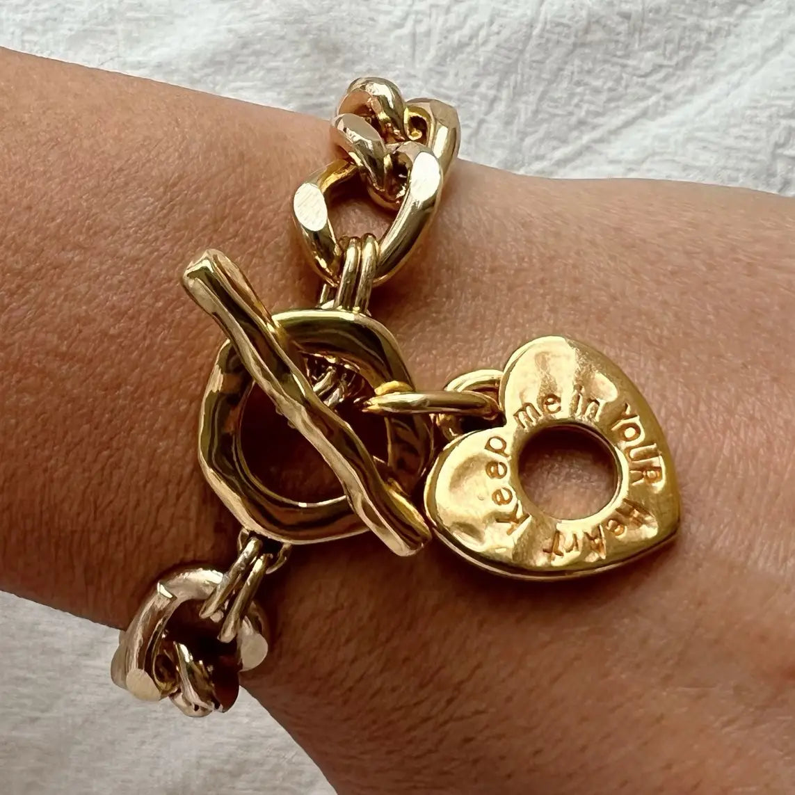 Elevate your accessory collection with this Gold Chunky Chain Bracelet featuring a delicate heart charm. Crafted for durability and style, its bold links offer a contemporary edge while the heart detail adds a timeless touch. Perfect for layering or wearing solo, this bracelet combines sophistication with everyday versatility.