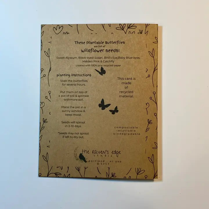 Celebrate sustainably with our Plantable Birthday Card | Seed Butterflies! Made of recycled & sustainable content, these exceptional quality cards feature a flower design with "Happy Birthday" on heavy 100% recycled paper. Plus, the 2 plantable butterfly die cuts are made of 100% recycled material infused with wildflower seeds to help save trees and feed bees.
