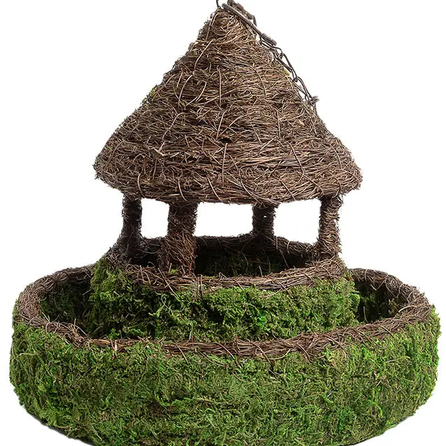 Expertly crafted from durable Moss Weave material, the Plantable Gazebo Birdfeeder offers both functionality and elegance for your garden. Designed to withstand outdoor elements for multiple years without deterioration, this birdfeeder maintains its structural integrity through all seasons. Each gazebo comes complete with a quality chain for effortless hanging from tree branches or hooks, making it an ideal addition to any outdoor space.