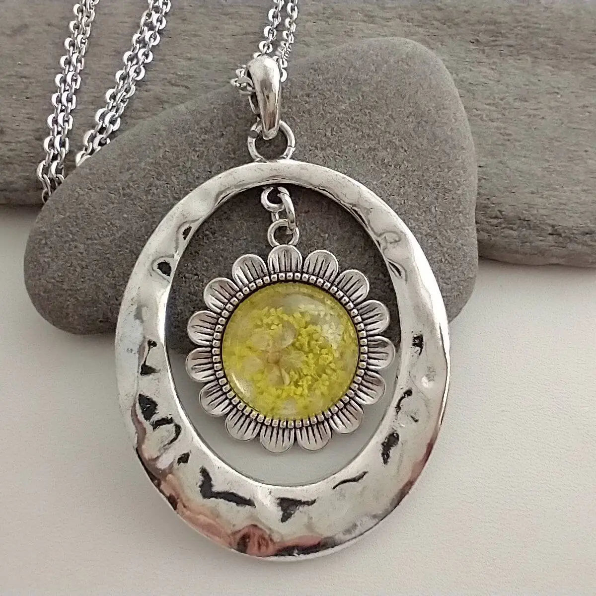 Discover the beauty of nature with our Pressed Flower Statement Necklace. Each unique piece features real pressed flowers encased in resin for a one-of-a-kind design. Handcrafted with care, this necklace is a stunning accessory that adds a touch of elegance to any outfit. Bring a piece of nature with you wherever you go.