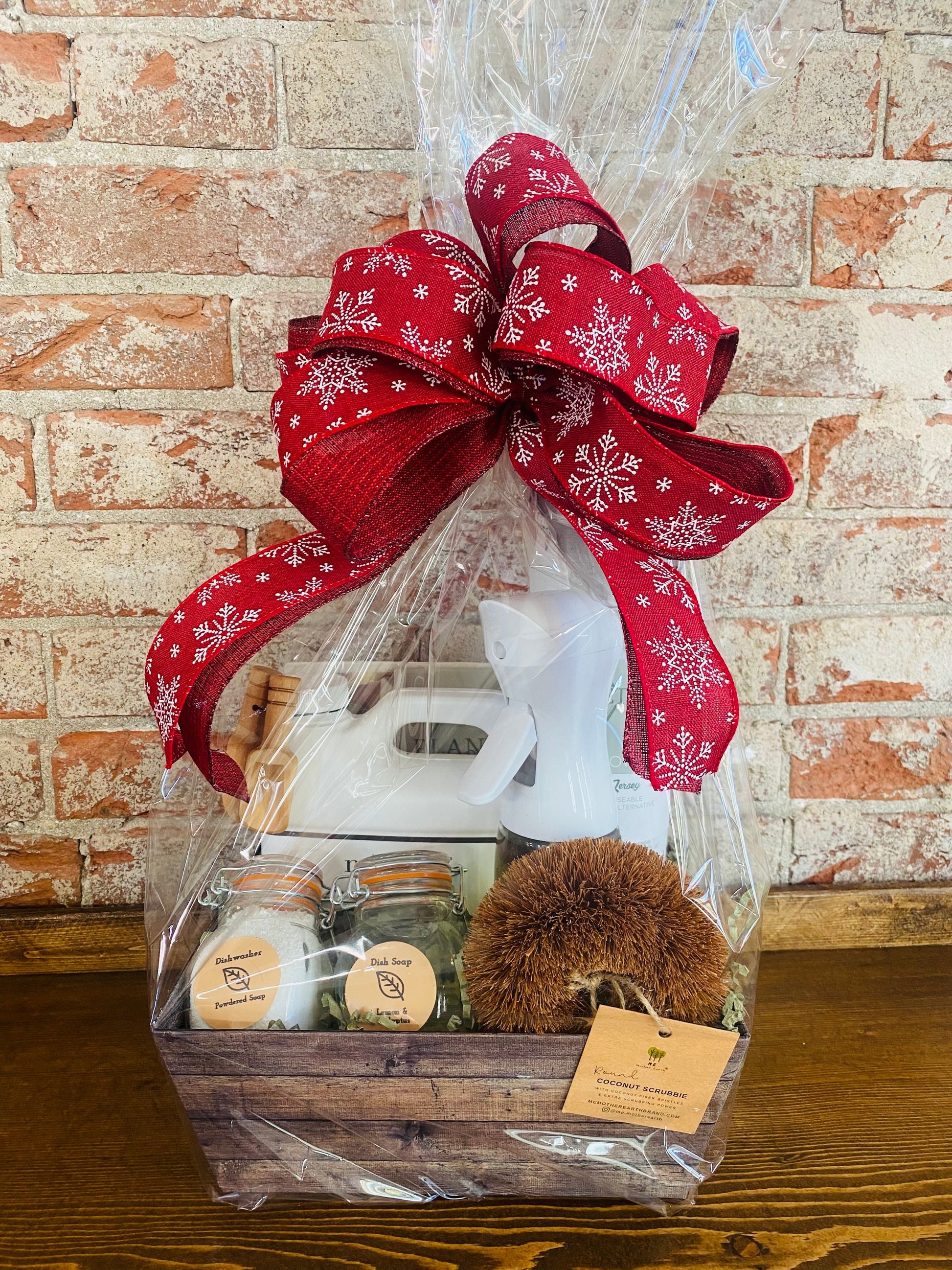This bag contains all the goodies to keep your home clean with all eco friendly products. Including items from our Refillery like eco friendly dish soap, dish powder, castille spray, reusable paper towels, swedish dish cloths, coconut scrubbie, beeswax wrap.